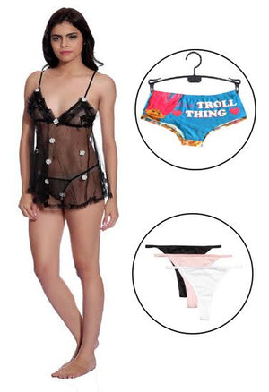 This amazing Sexy & Romantic Lingerie First Night Gift Pack, and make your beloved feel extra special and loved. The sexy see through chemise and string thong holds a very special significance. The ‘perfect lingerie’ denotes perfection, and special attention which help to belief that she looks perfect. This Sexy & Romantic Lingerie First Night Gift Pack will serve to express your emotions without you having to say a single word.