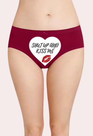 Shut Up and Kiss Me Custom Panty for Her” is a humorous and intimate underwear piece that add cheekiness to your collection. High-quality, soft-touch fabrics make this bespoke panty comfortable and stylish.Its personalised touch makes this underwear stand out. You may personalise the panty with a message or name, making it a wonderful gift or treat for yourself. The playful and flirtatious “Shut Up and Kiss Me” embroidery makes a statement. Whether you’re looking to surprise your partner or indulge in a little self-love, the “Shut Up and Kiss Me Custom Panty for Her” is a perfect choice, offering a blend of personalization, style, and comfort that will leave a lasting impression.